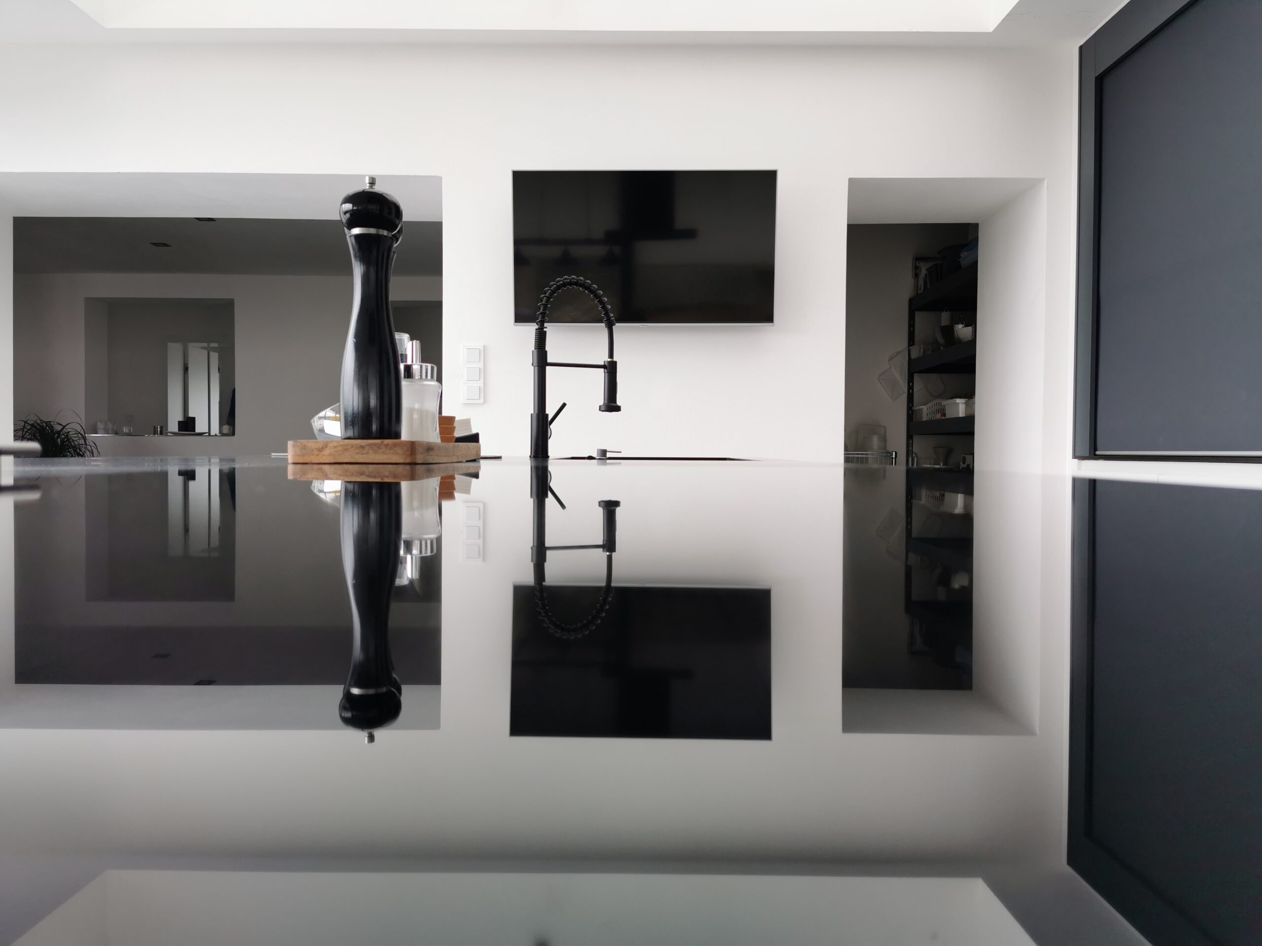 Dominantou prostoru je výrazný kontrast mezi čistě bílými plochami a hlubokým tmavým dekorem, který dodává interiéru jasnou identitu.