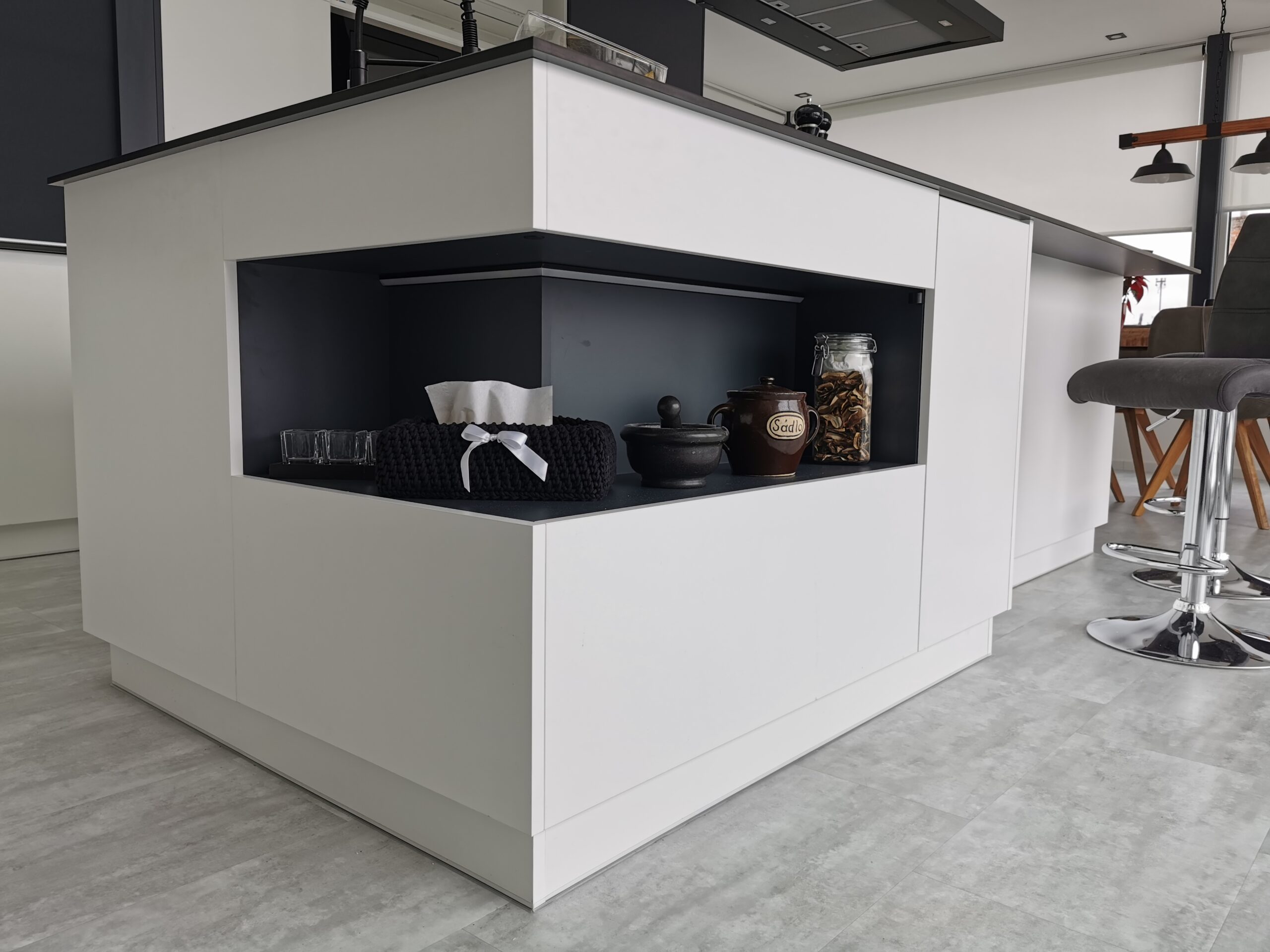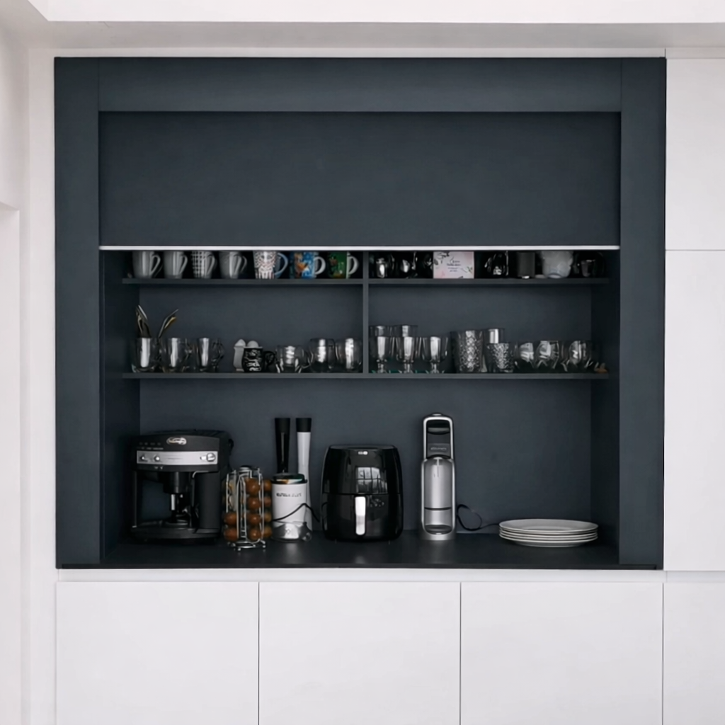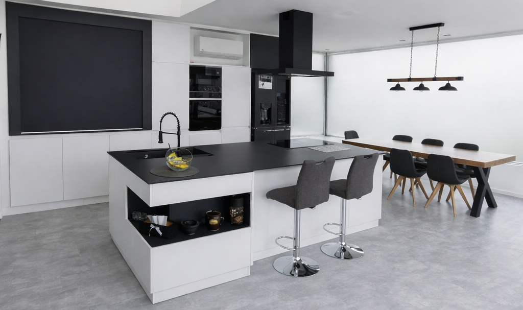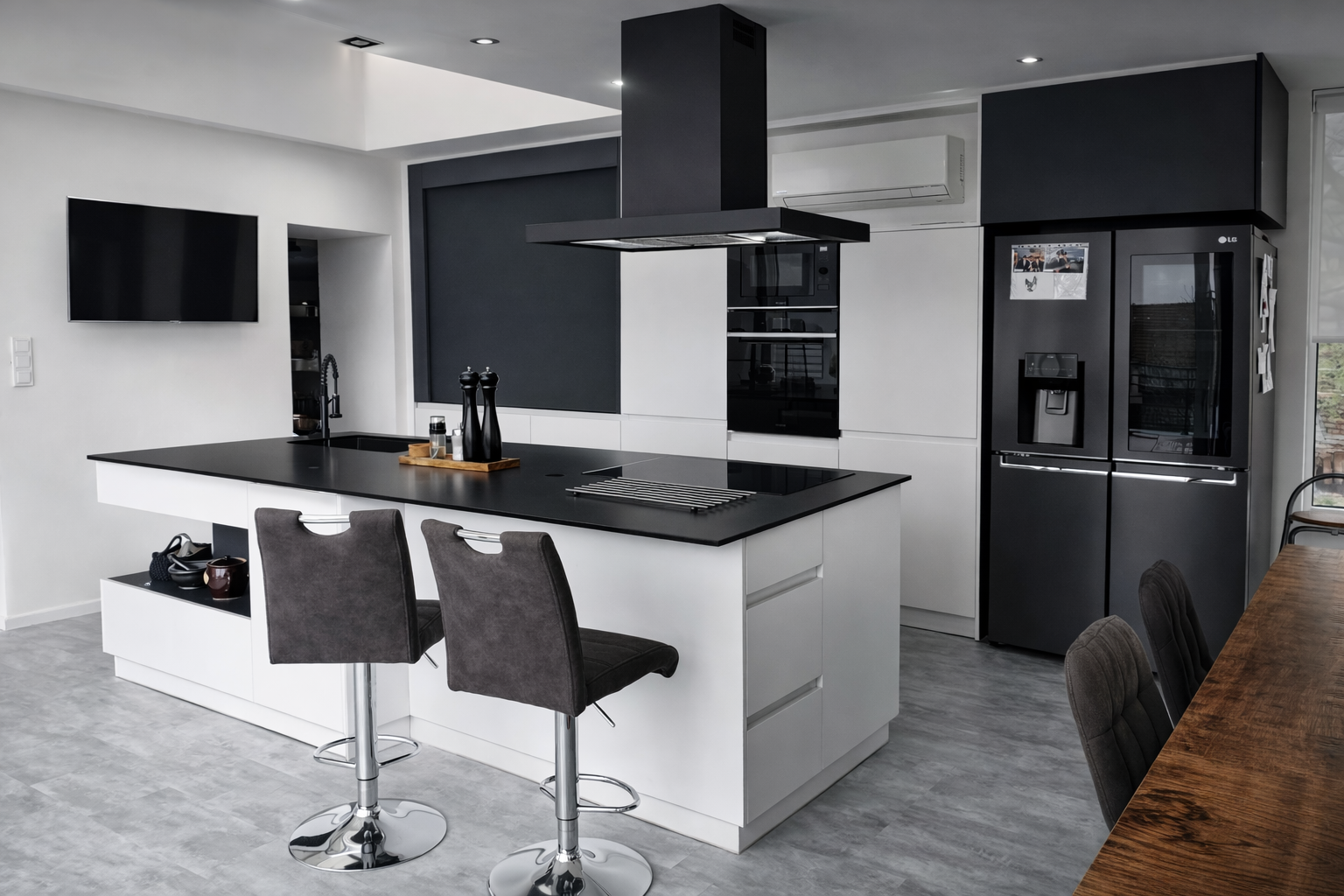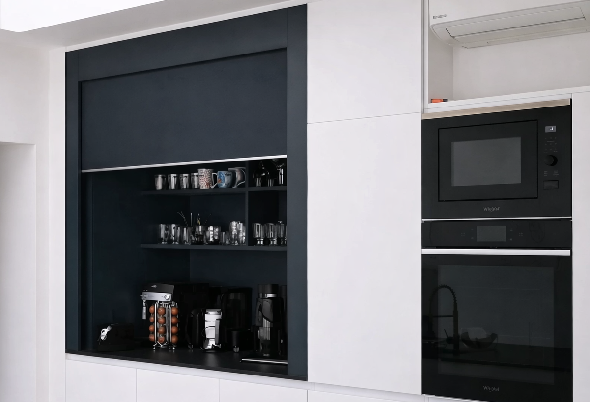 Kuchyňský ostrůvek s masivní pracovní deskou působí jako centrální prvek, kde se spojuje estetika s každodenní funkčností. Otevřená nika s tmavým vnitřkem vytváří elegantní zázemí pro spotřebiče a sklo, zatímco hladké plochy skříněk zachovávají vizuální klid. Precizně navržené detaily, od zapuštěných úchytů po navazující linie, podtrhují čistotu celého řešení. Kování BLUM zajišťuje plynulý chod a dlouhodobou spolehlivost i při intenzivním používání.