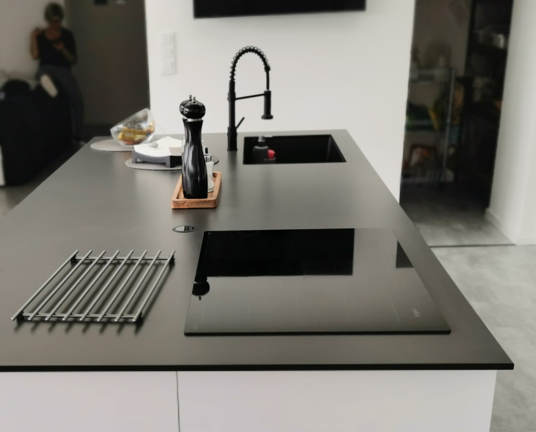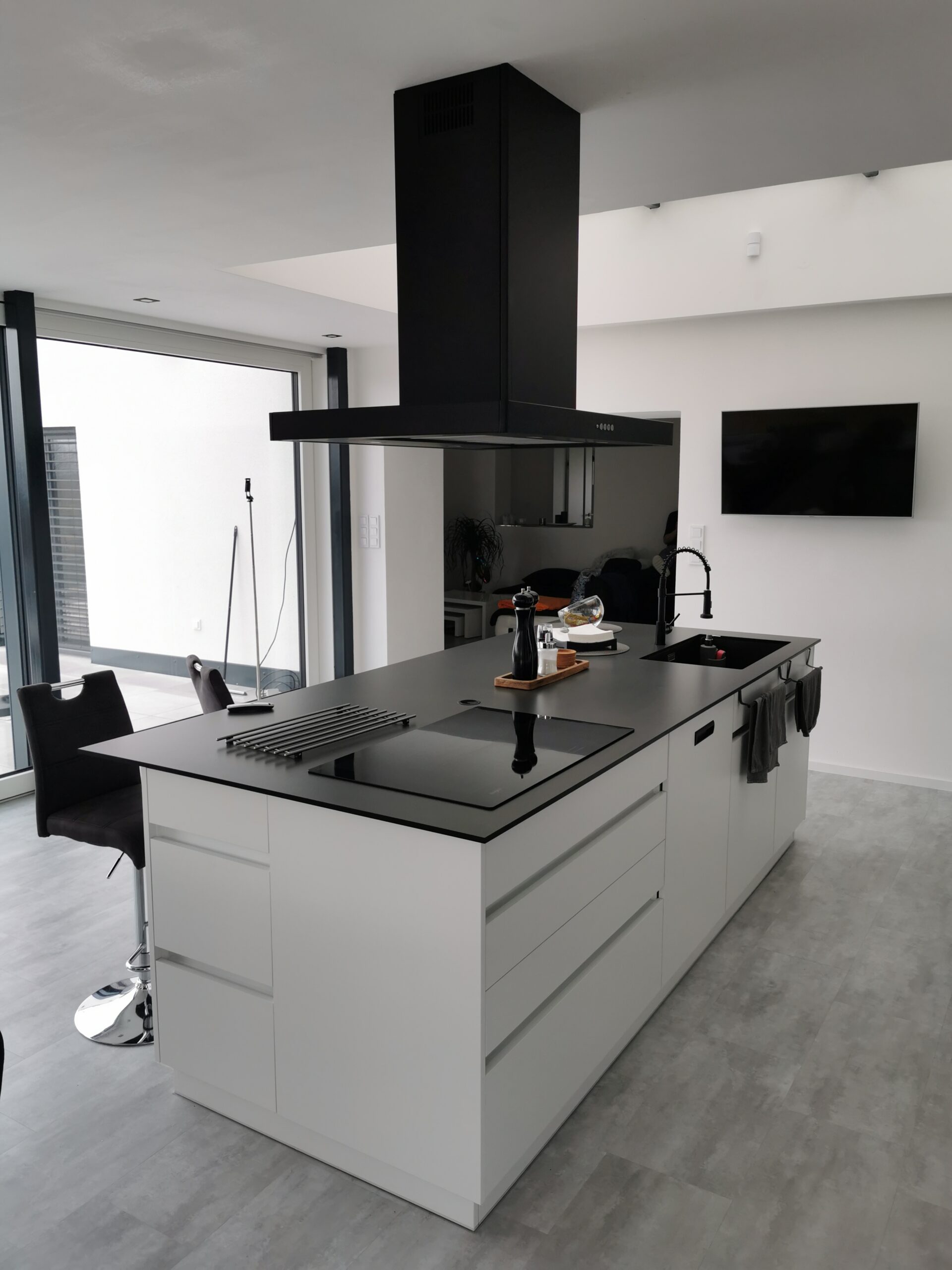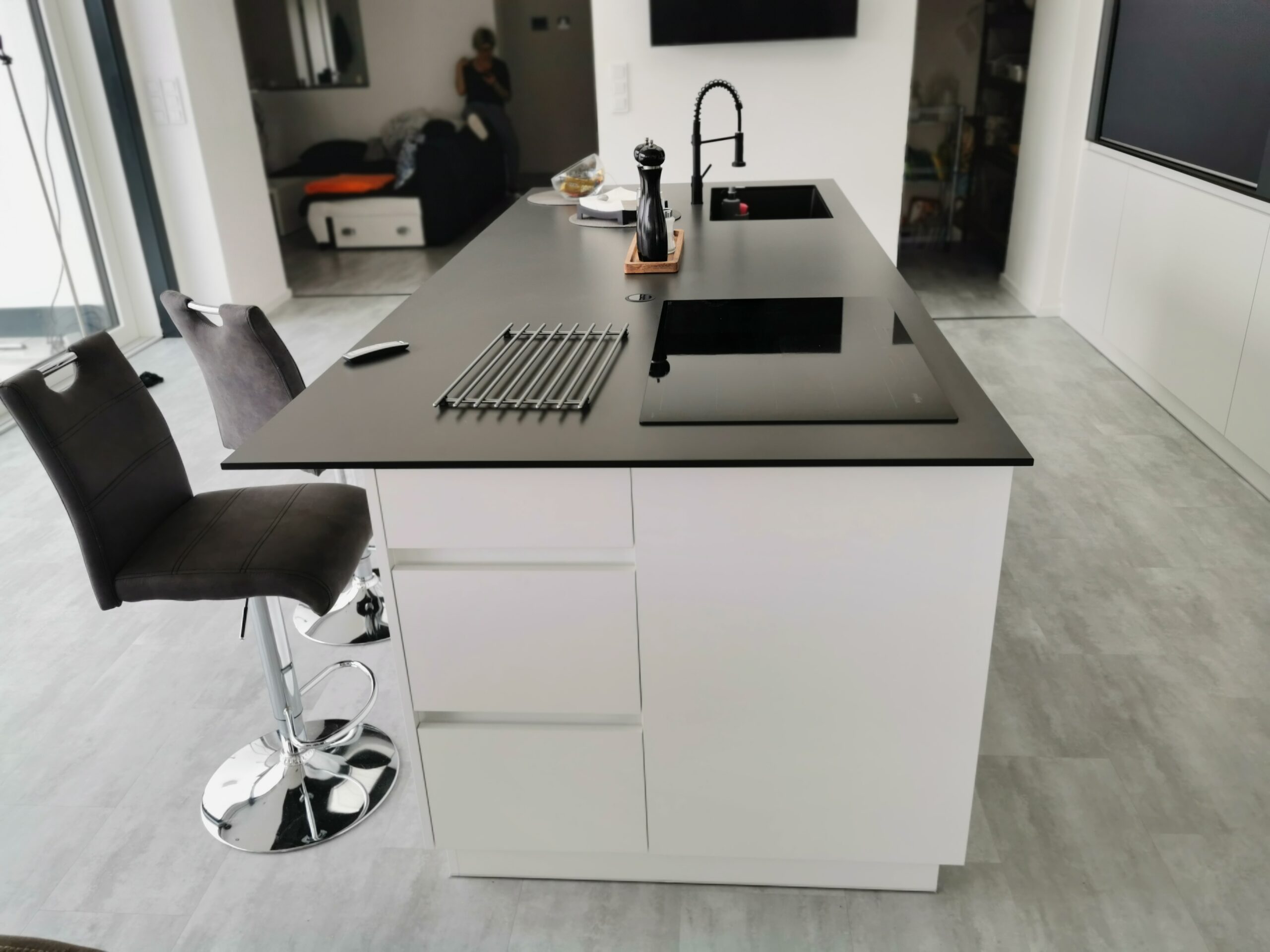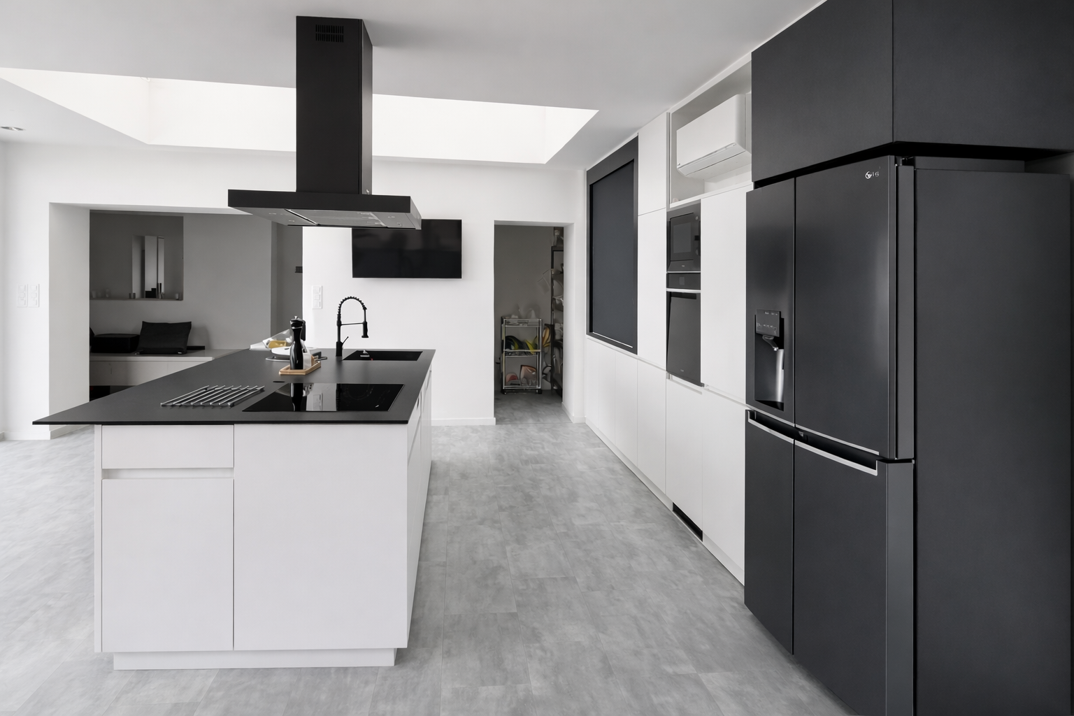 Kuchyňský ostrůvek s masivní pracovní deskou působí jako centrální prvek, kde se spojuje estetika s každodenní funkčností. Otevřená nika s tmavým vnitřkem vytváří elegantní zázemí pro spotřebiče a sklo, zatímco hladké plochy skříněk zachovávají vizuální klid. Precizně navržené detaily, od zapuštěných úchytů po navazující linie, podtrhují čistotu celého řešení. Kování BLUM zajišťuje plynulý chod a dlouhodobou spolehlivost i při intenzivním používání.