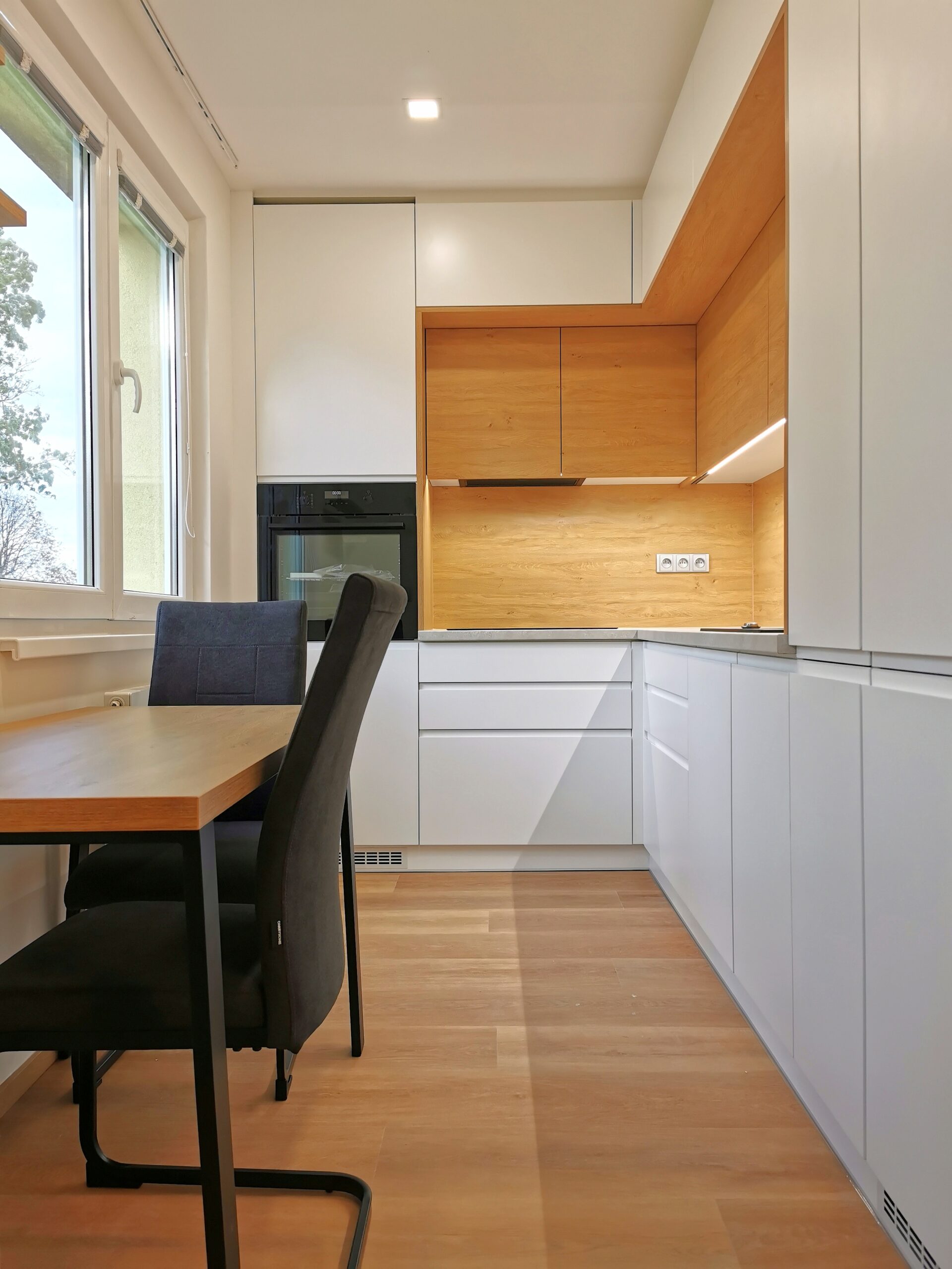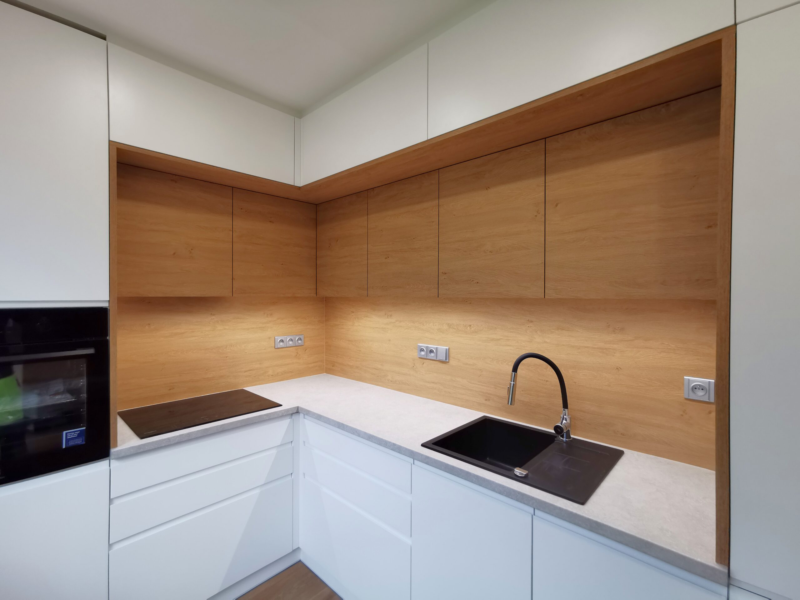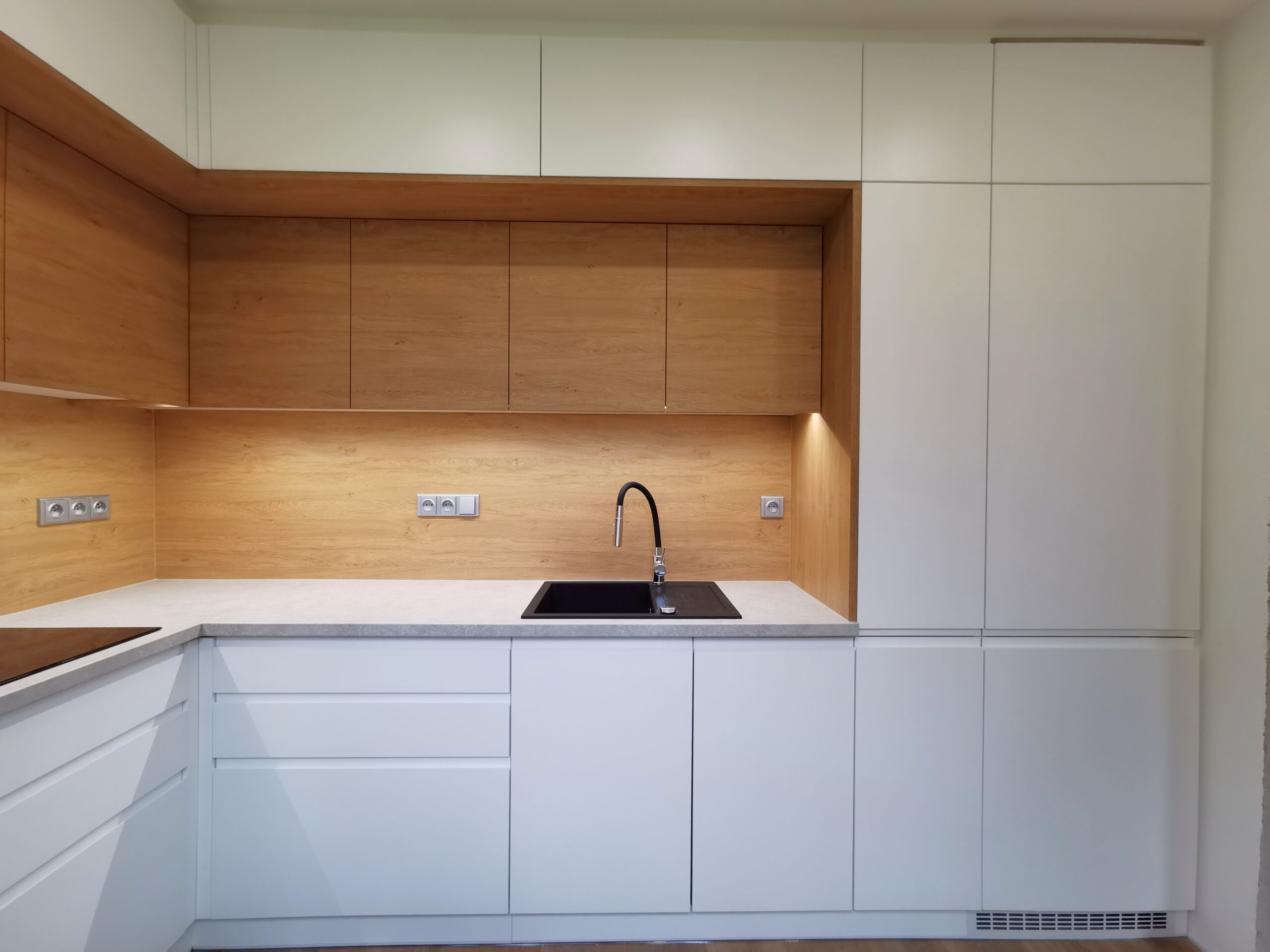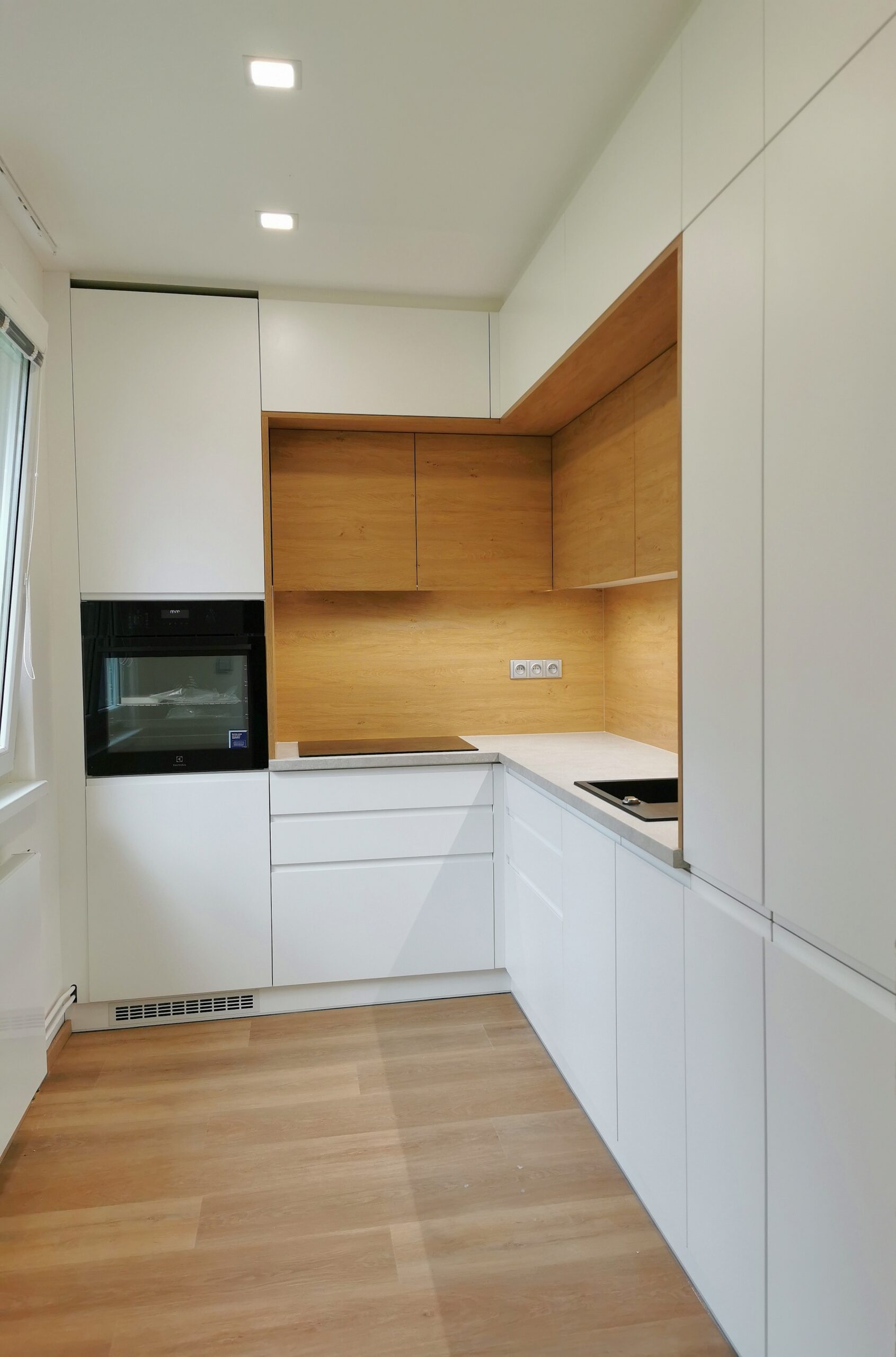 Tato kuchyně na míru je navržena jako kompaktní a plně funkční řešení do menšího prostoru s dispozicí do tvaru L. Dominantou je kombinace bílých matných ploch s teplým dekorem dřeva, který plynule navazuje na pracovní zónu i horní skříňky a vytváří jednotný celek. Pracovní deska v světlém kamenném dekoru působí čistě a zároveň je praktická na údržbu.