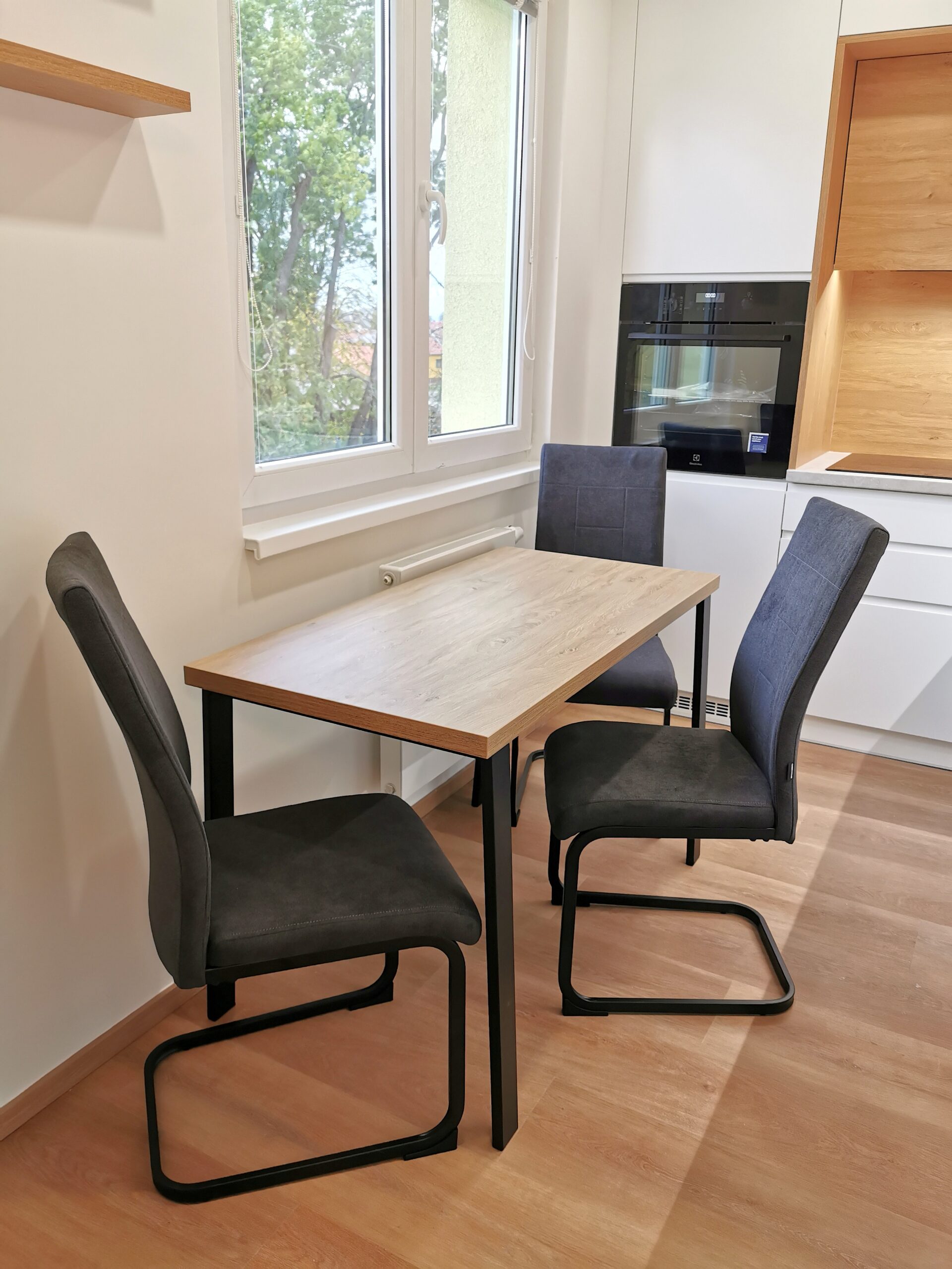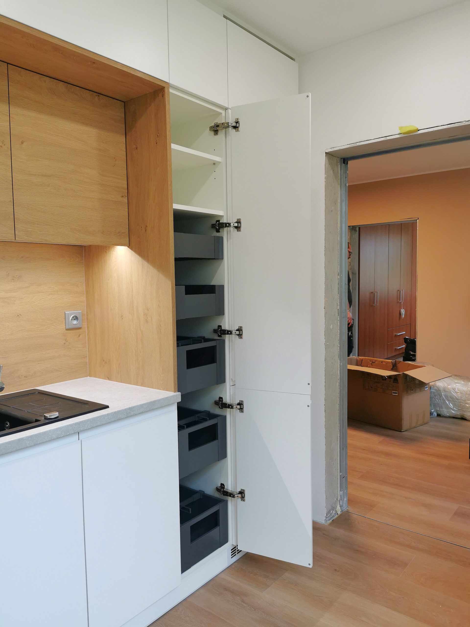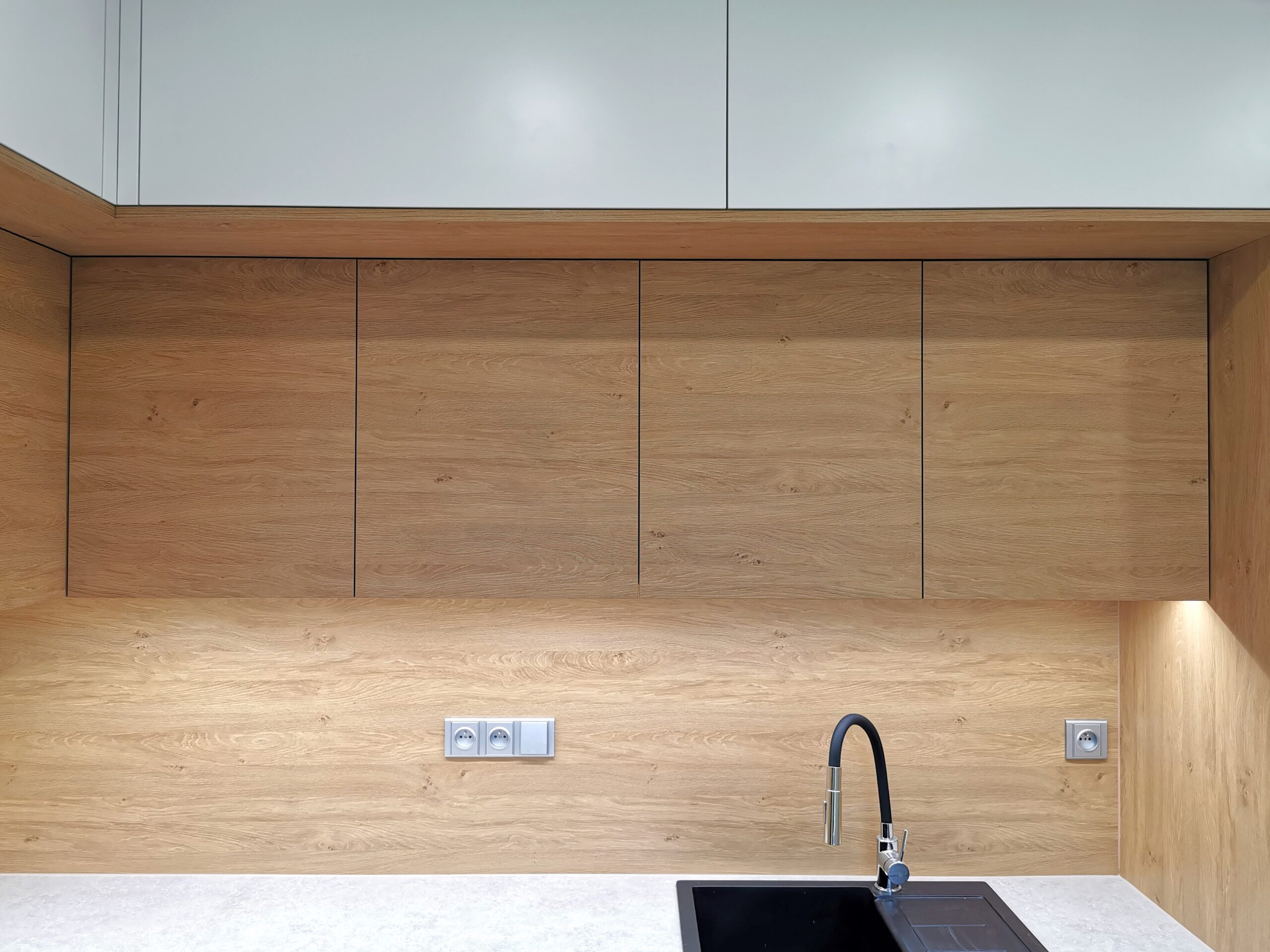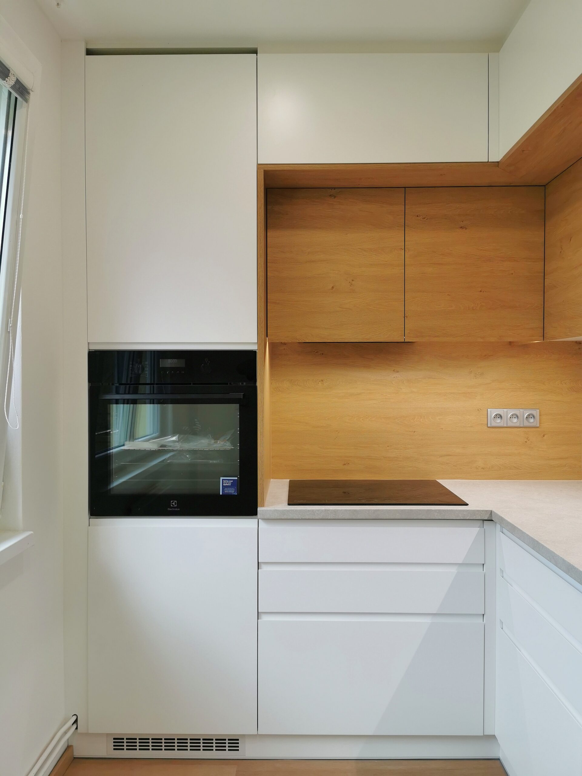 Tato kuchyně na míru je navržena jako kompaktní a plně funkční řešení do menšího prostoru s dispozicí do tvaru L. Dominantou je kombinace bílých matných ploch s teplým dekorem dřeva, který plynule navazuje na pracovní zónu i horní skříňky a vytváří jednotný celek. Pracovní deska v světlém kamenném dekoru působí čistě a zároveň je praktická na údržbu.