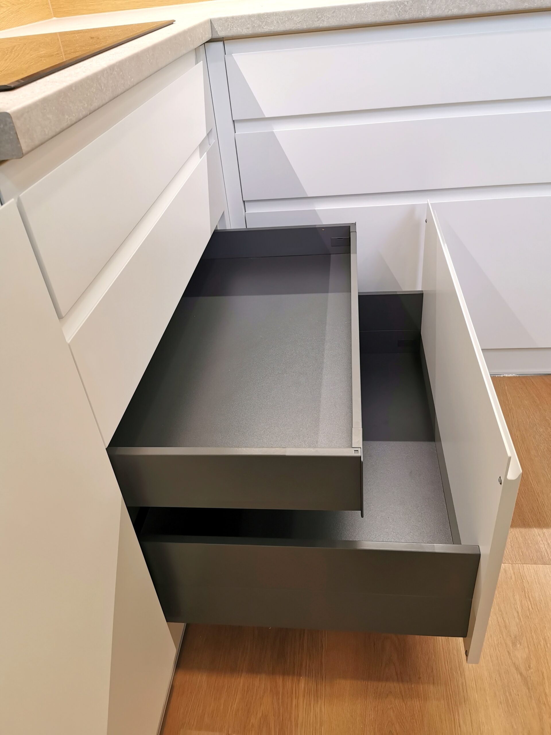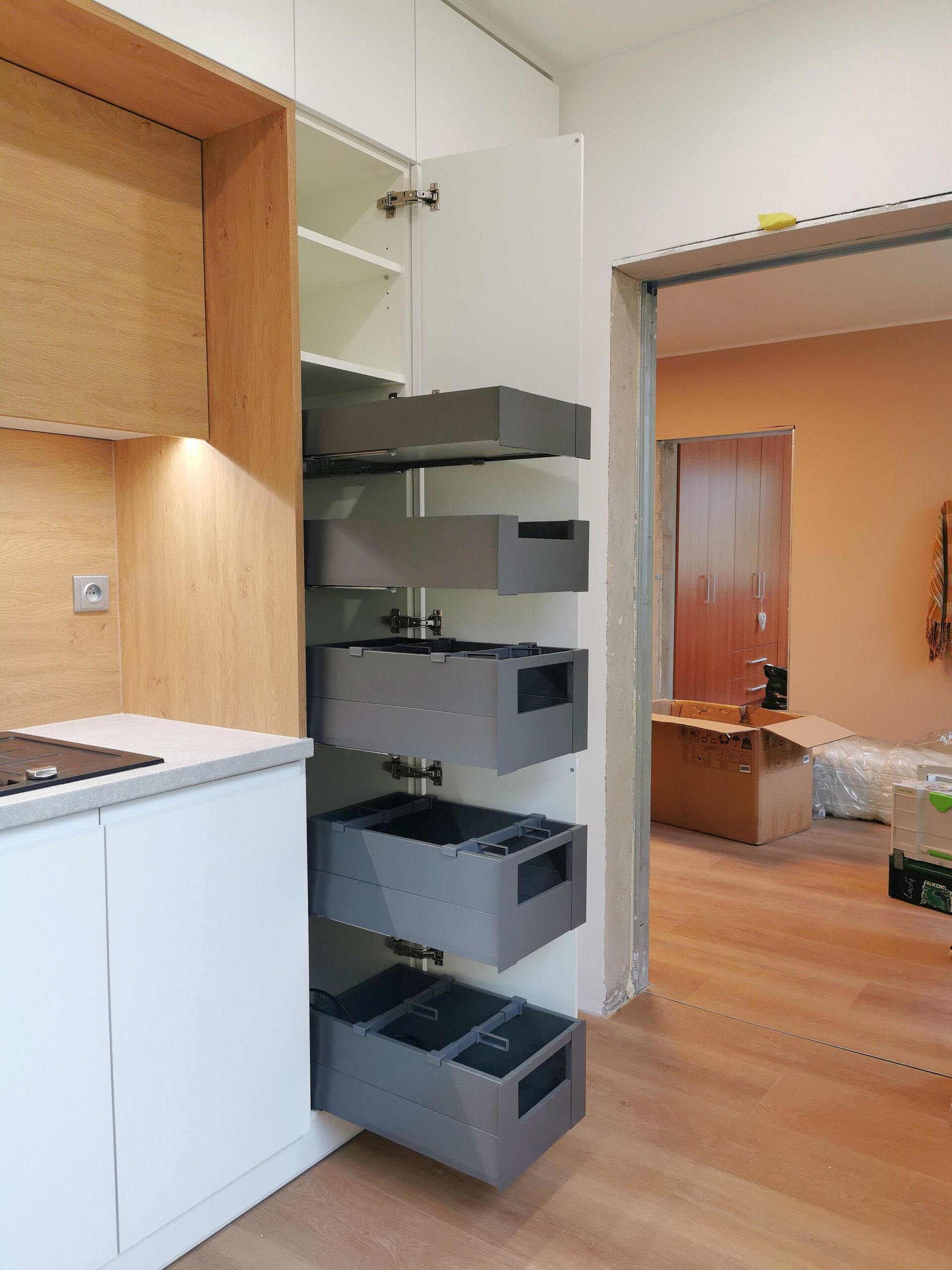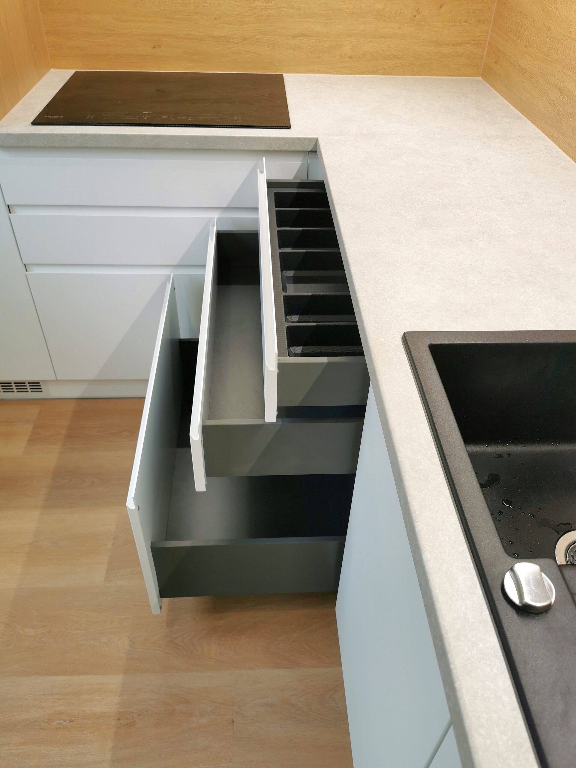 Velký důraz byl kladen na vnitřní organizaci – zásuvky s plnovýsuvy, vnitřní členění a výsuvné systémy maximalizují využití prostoru a zajišťují komfort při každodenním používání. Kování BLUM garantuje plynulý chod, tichý dojezd a dlouhou životnost. Dřez značky Blanco doplňuje funkční pracovní zónu a potvrzuje důraz na kvalitu použitých komponentů. Celkově jde o moderní kuchyni, která kombinuje estetiku s maximální praktičností.