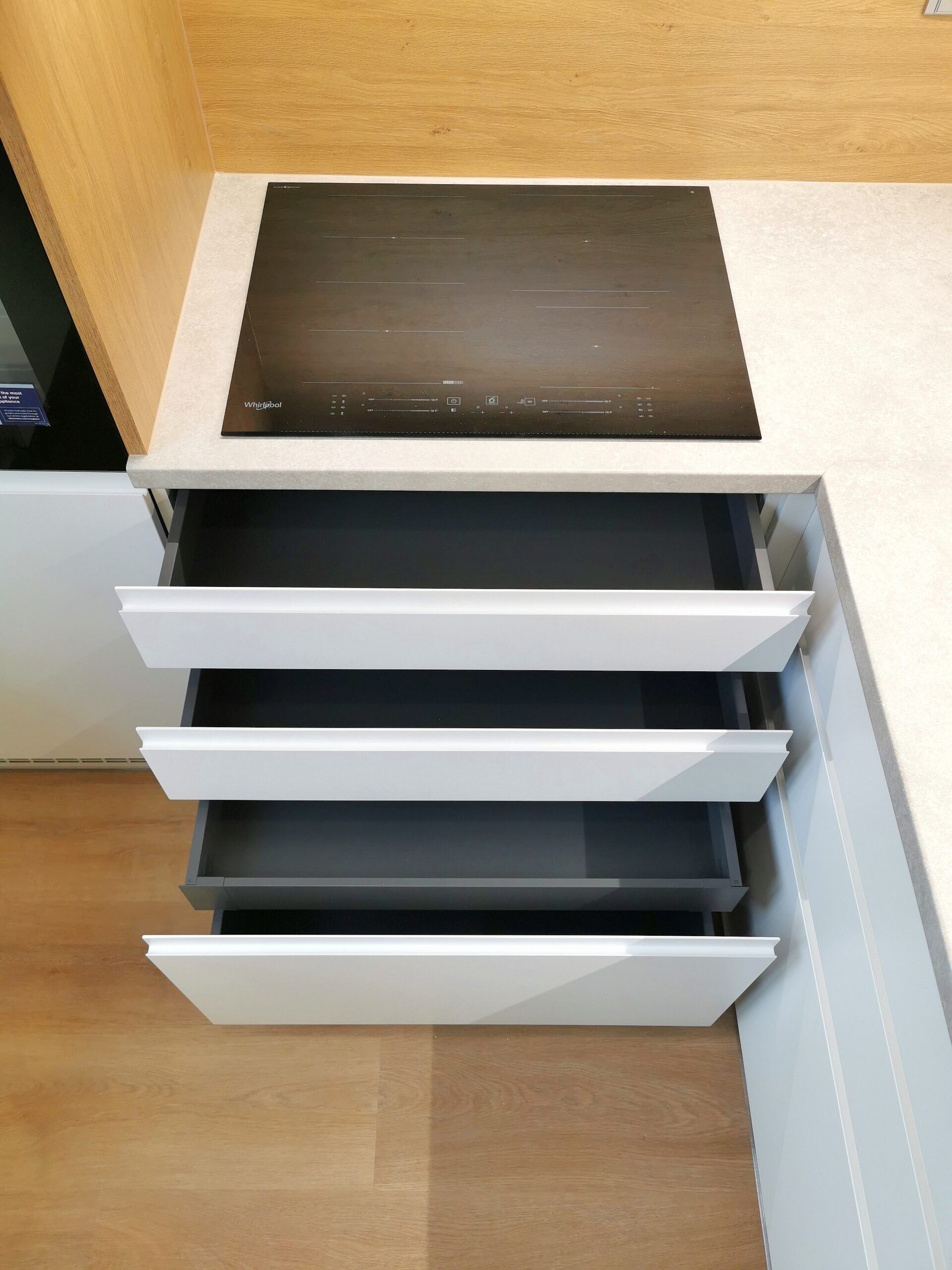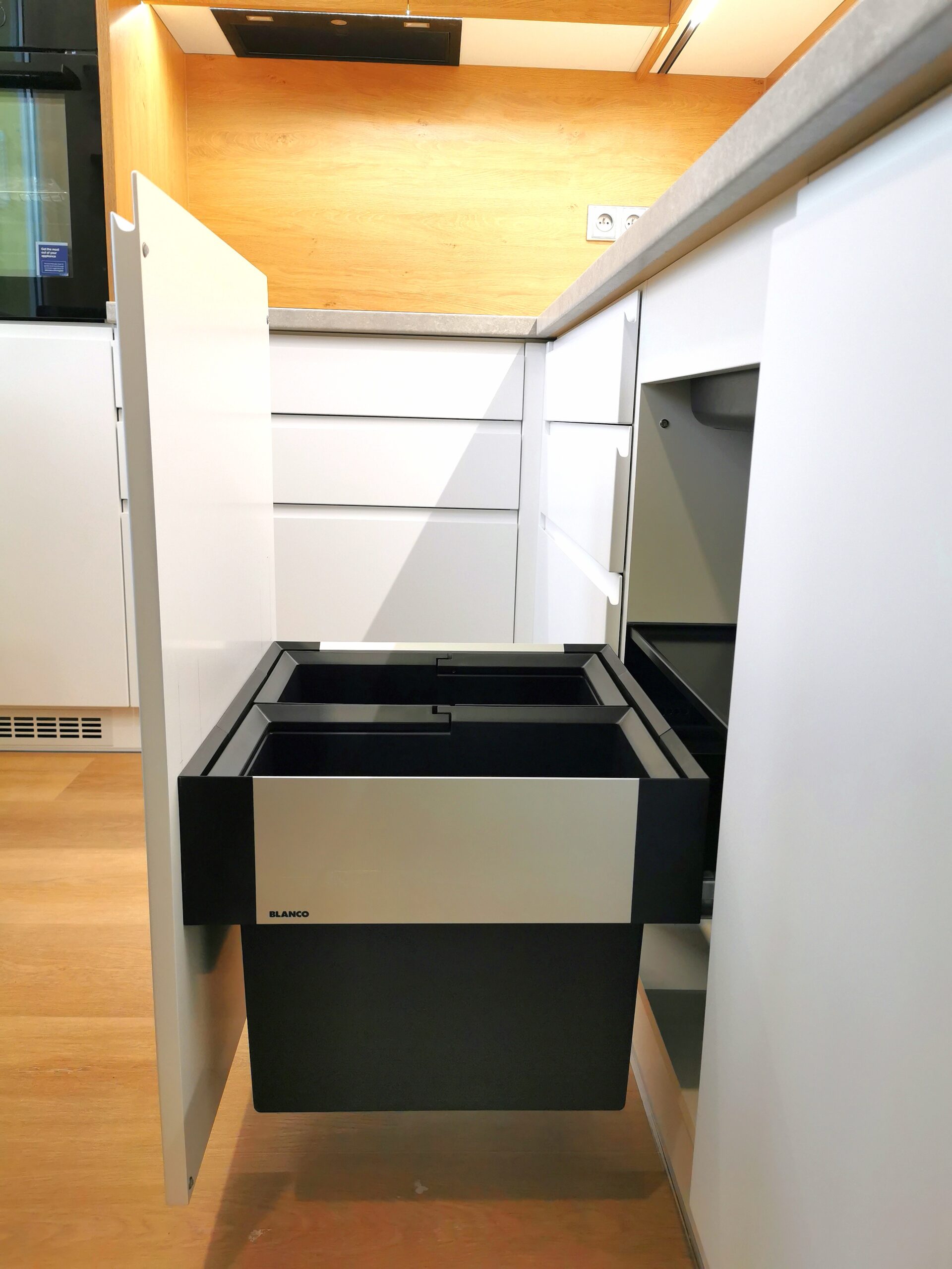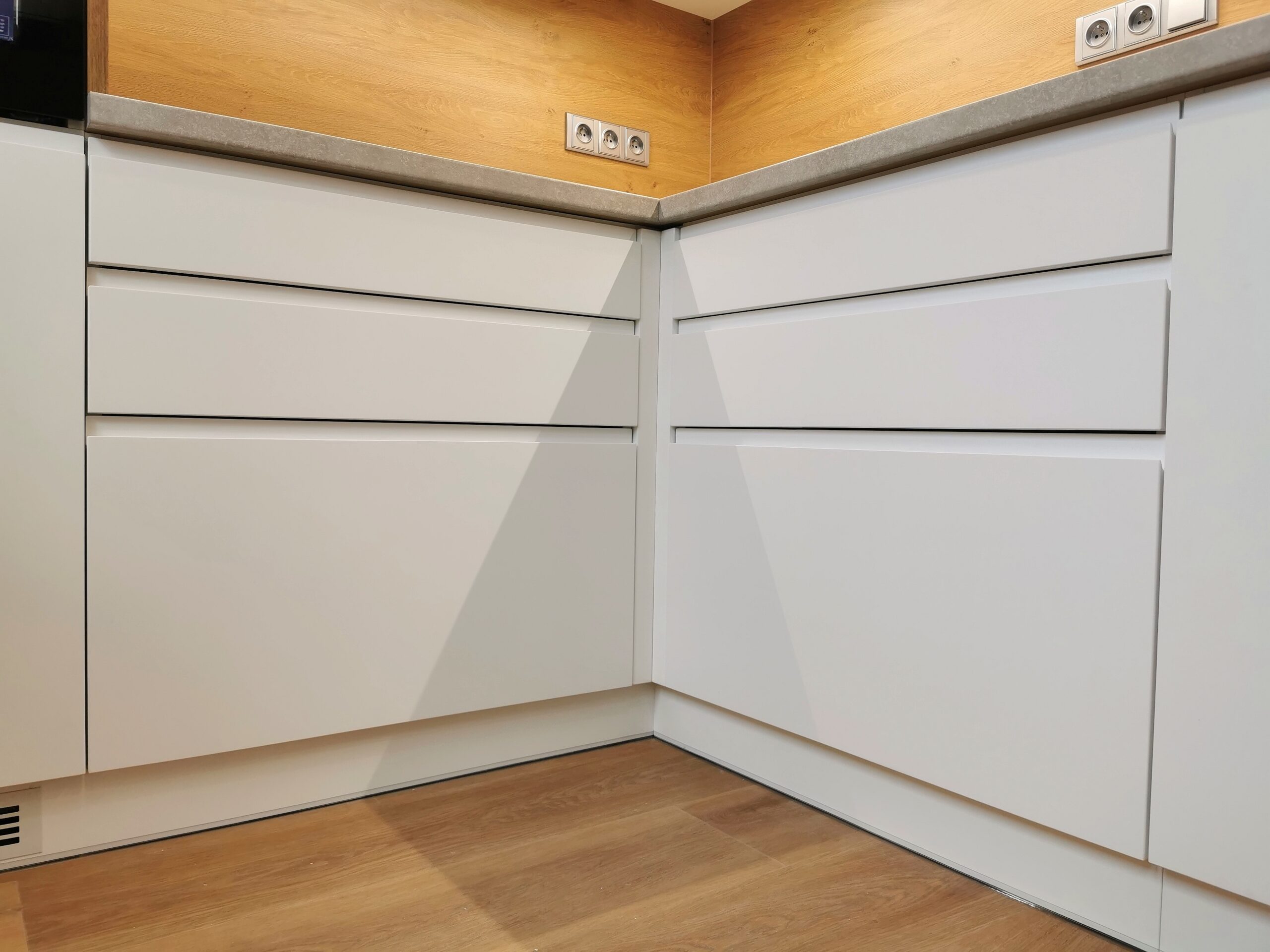 Velký důraz byl kladen na vnitřní organizaci – zásuvky s plnovýsuvy, vnitřní členění a výsuvné systémy maximalizují využití prostoru a zajišťují komfort při každodenním používání. Kování BLUM garantuje plynulý chod, tichý dojezd a dlouhou životnost. Dřez značky Blanco doplňuje funkční pracovní zónu a potvrzuje důraz na kvalitu použitých komponentů. Celkově jde o moderní kuchyni, která kombinuje estetiku s maximální praktičností.