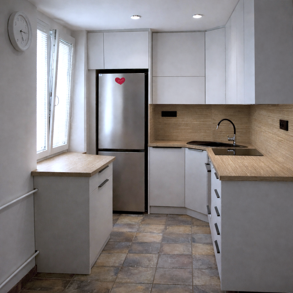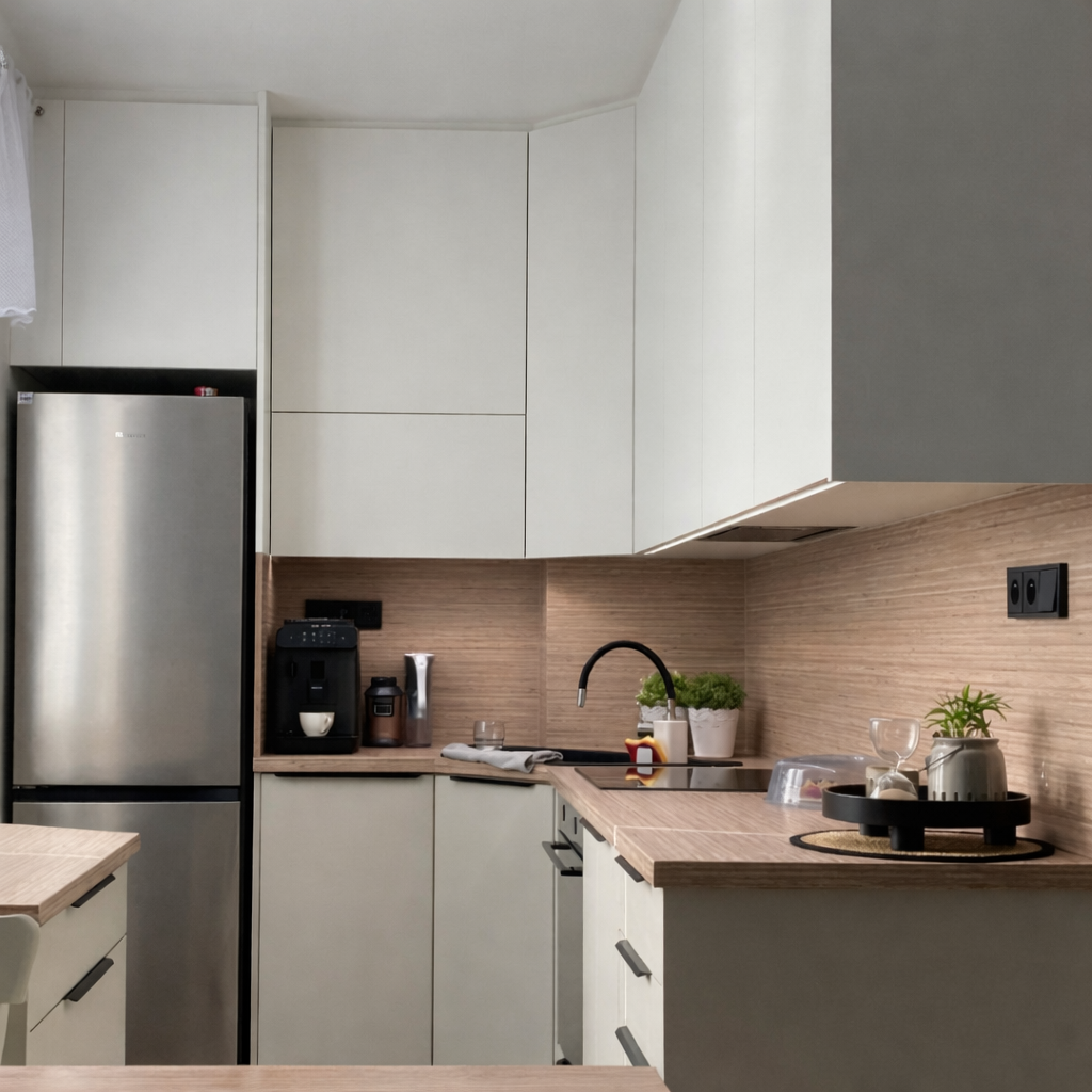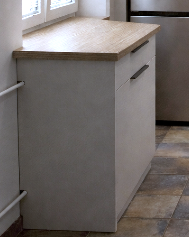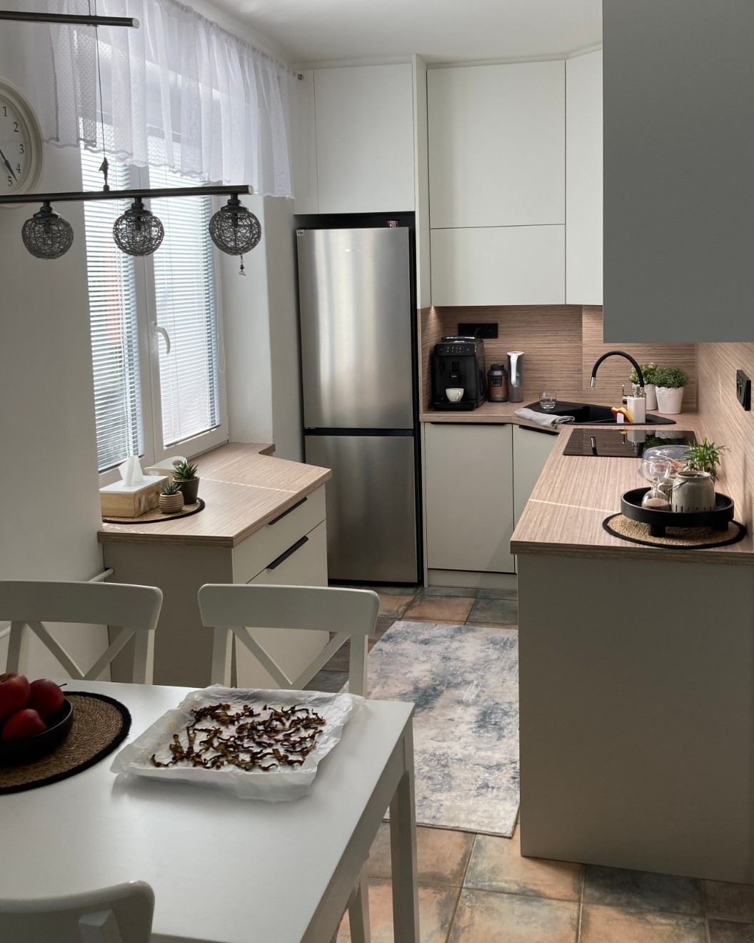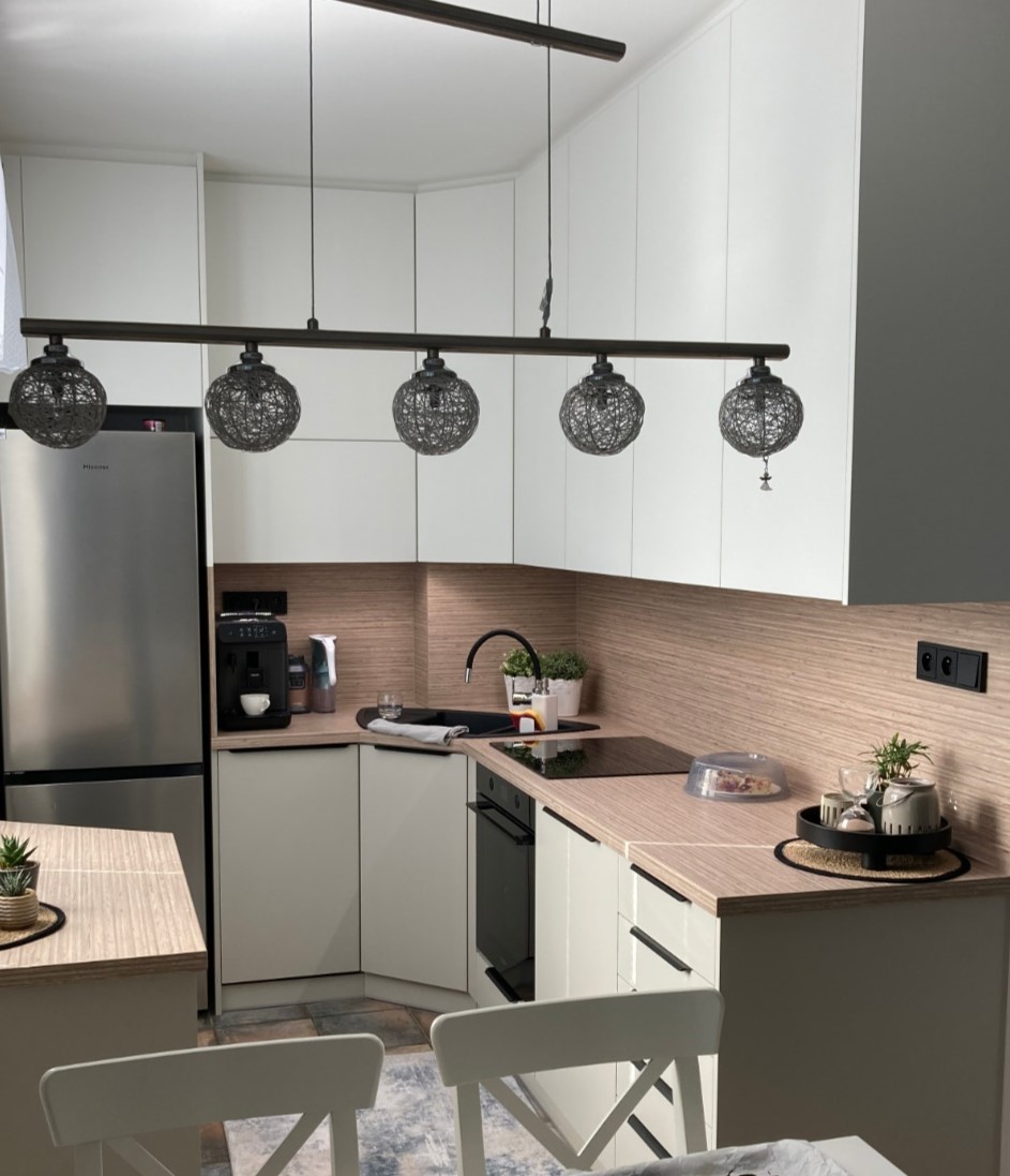 Tato kuchyně na míru je navržena jako kompaktní a plně funkční řešení do menšího prostoru. Dispozice do tvaru „L“ maximálně využívá dostupné místo a zároveň zachovává pohodlný pracovní trojúhelník mezi dřezem, varnou deskou a lednicí. Kombinace světlých, matných dvířek s dekorem přírodního dřeva na pracovní desce a zádové desce působí čistě a nadčasově. Horní skříňky jsou řešeny bez úchytek, spodní část doplňují decentní tmavé úchyty, což vytváří vyvážený kontrast. Rohové řešení kuchyně je navrženo s důrazem na maximální využití úložného prostoru bez zbytečných hluchých míst. Pod horními skříňkami je integrované LED osvětlení pracovní plochy, které zvyšuje komfort při práci. Součástí realizace je také praktický doplňkový blok u okna, který rozšiřuje pracovní plochu a výsuvný systém pod ním obsahuje odpadkové koše pro tříděný odpad. Kuchyně je vybavena kvalitním kováním BLUM pro dlouhou životnost a plynulý chod. Dřezy a baterie od prověřené značky Blanco přispívá jistotě v dobře investované finance a radosti z každodenního používání.